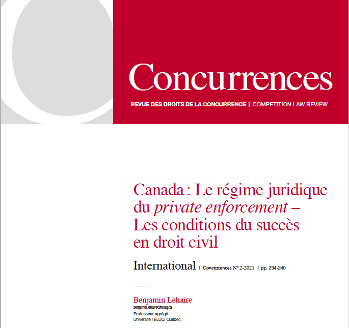 Je publie dans le numéro de mai 2021 de la revue Concurrences un article dont l’objectif est d’expliquer le dynamisme des actions collectives au Canada et particulièrement au Québec en droit civil. L’article est accessible ici.